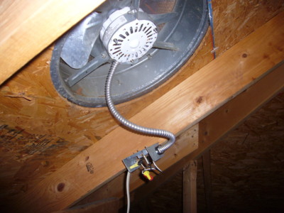 view of a power attic ventilator shows the wiring is exposed